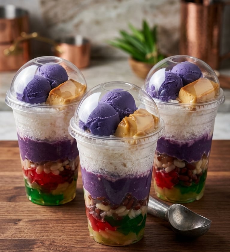 Shaved ice layered with sweetened fruits, beans, jellies, and coconut, topped with evaporated milk, ube halaya (purple yam jam), leche flan, and ube ice cream. Mixed together before eating.