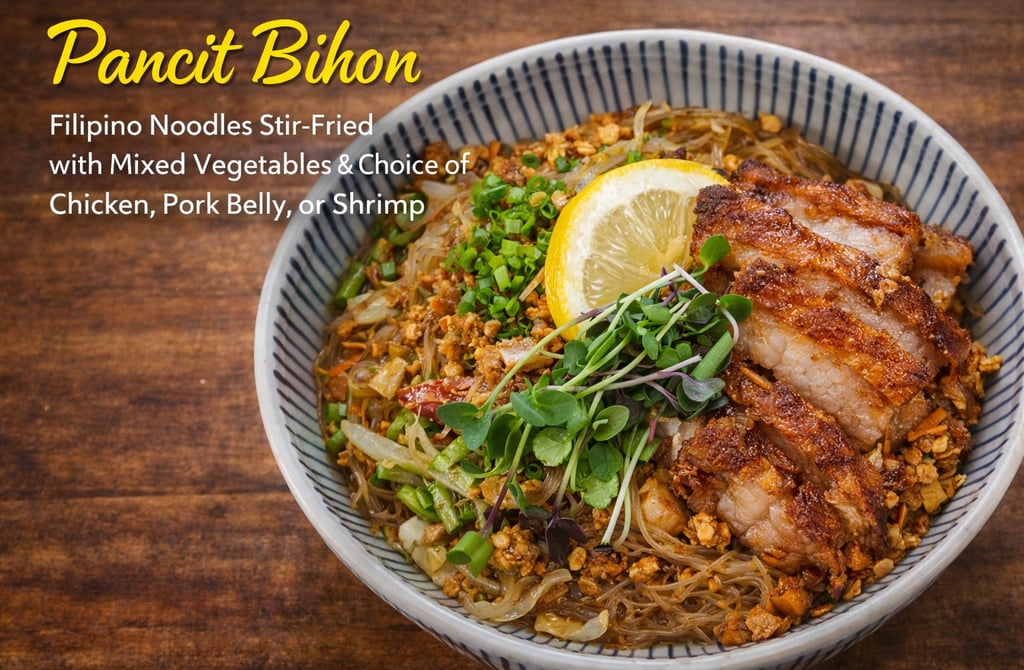 Enjoy Pancit Bihon in Halifax at Barrios. Stir fry mixed vegetables with rice noodles and your choice of grilled chicken, crispy pork belly, or shrimp for a light and flavorful Filipino dish.